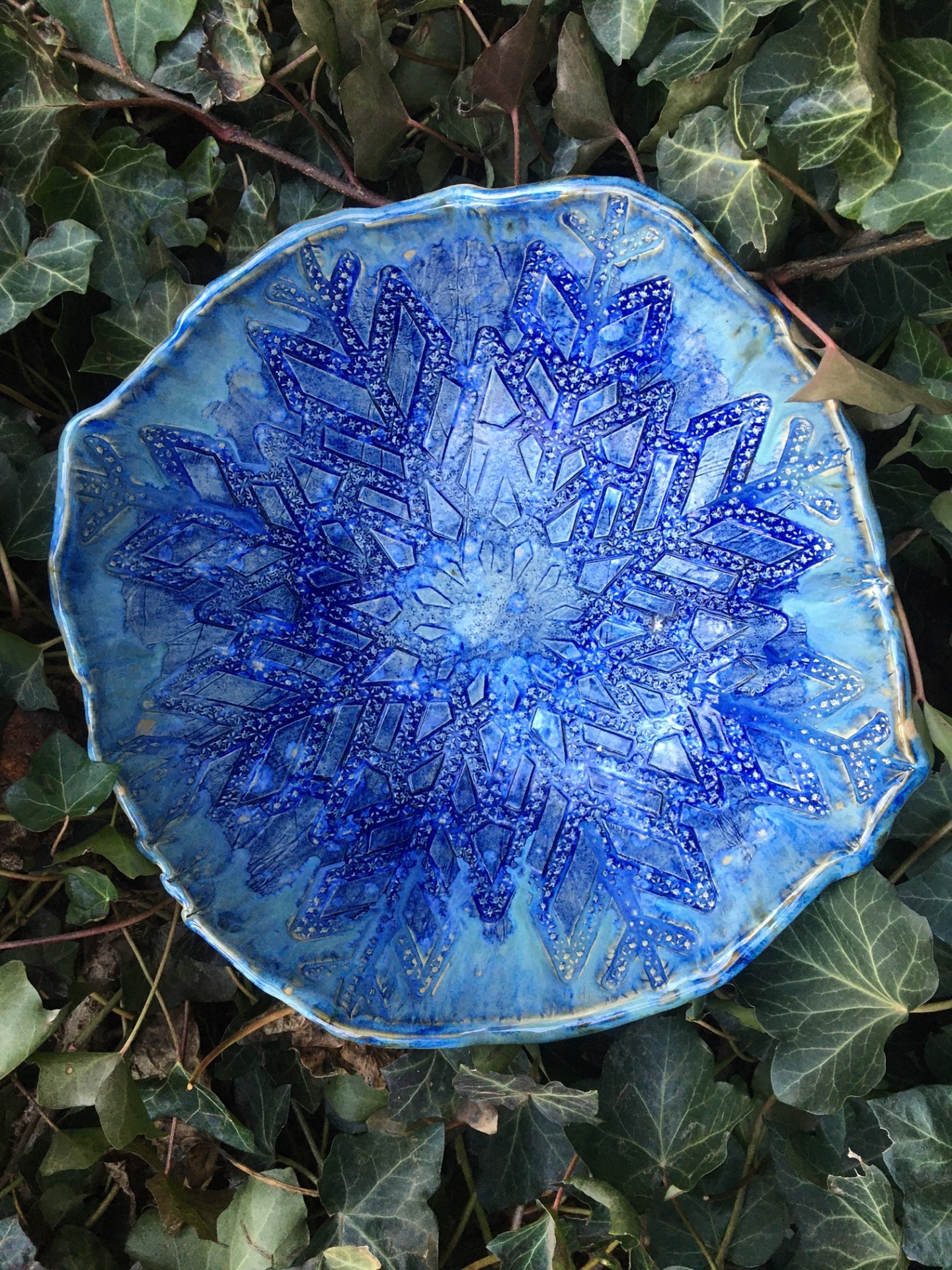 Veľká masívna dekoratívna, ale i úžitková misa s motívom snehovej vločky. Priemer cca 30-35 cm.