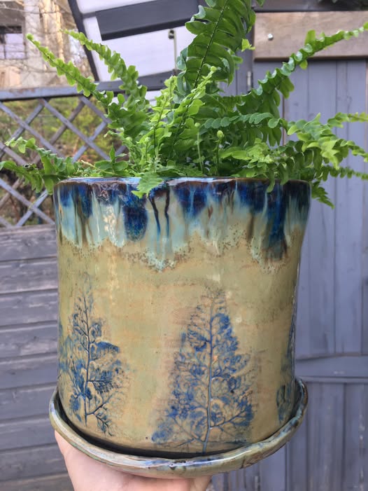 Stredne veľký črepník s motívom modreho papradia, s podtanierikom.