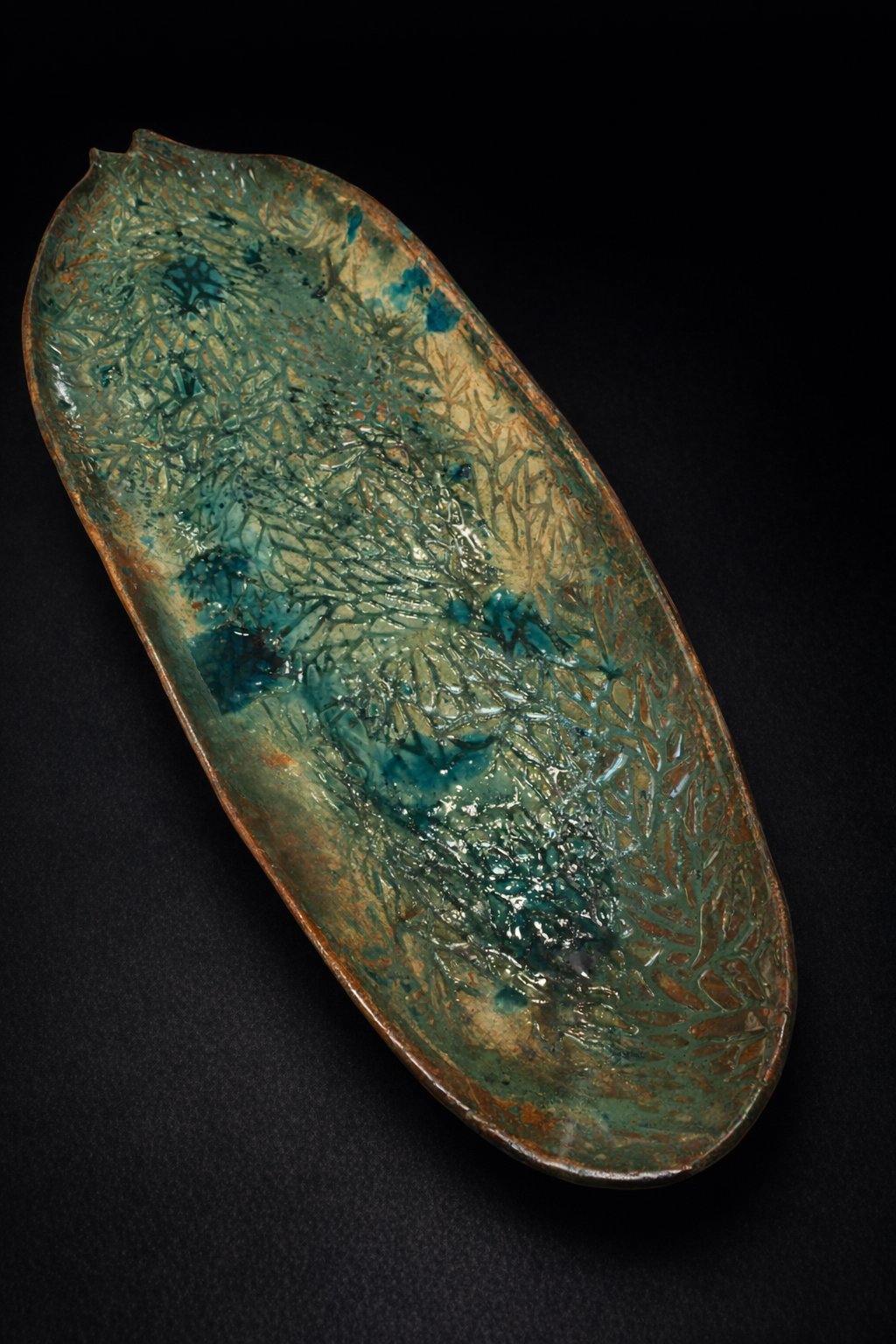Elegantna servirovacia misa v tvare podlhovastehpo listu, dĺžka cca 35 cm.