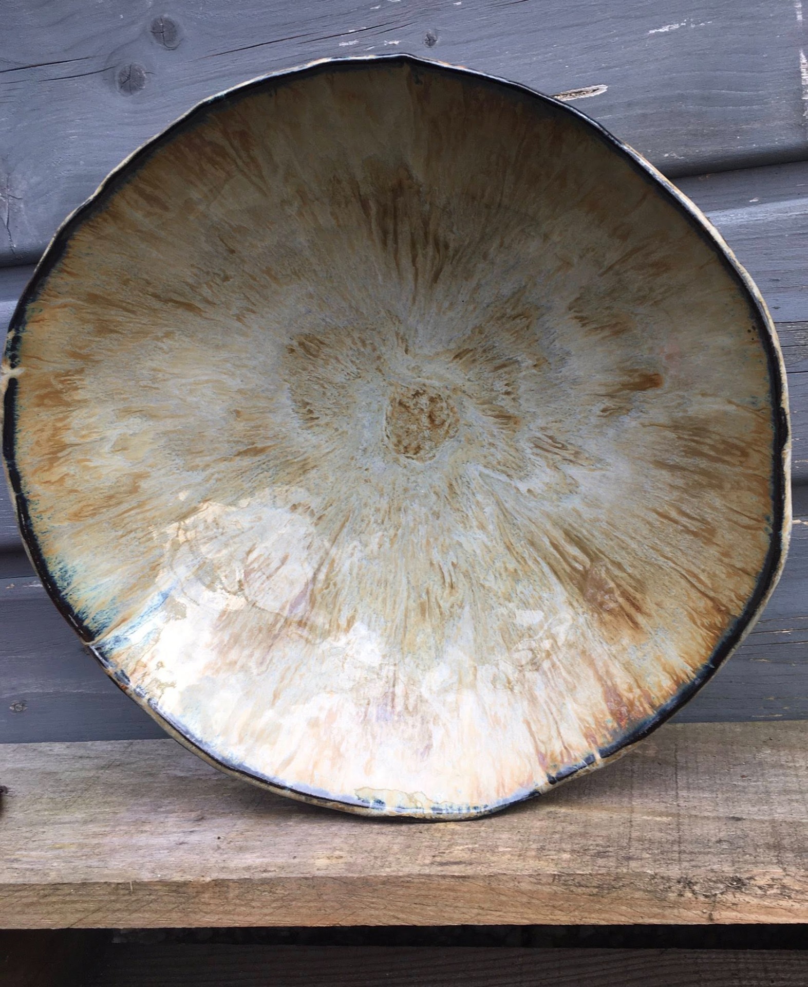 Veľká misa v zlatobéžovej farbe s jemnými farebnými odbleskami, na ovocie, ale i zemiakový šalát.